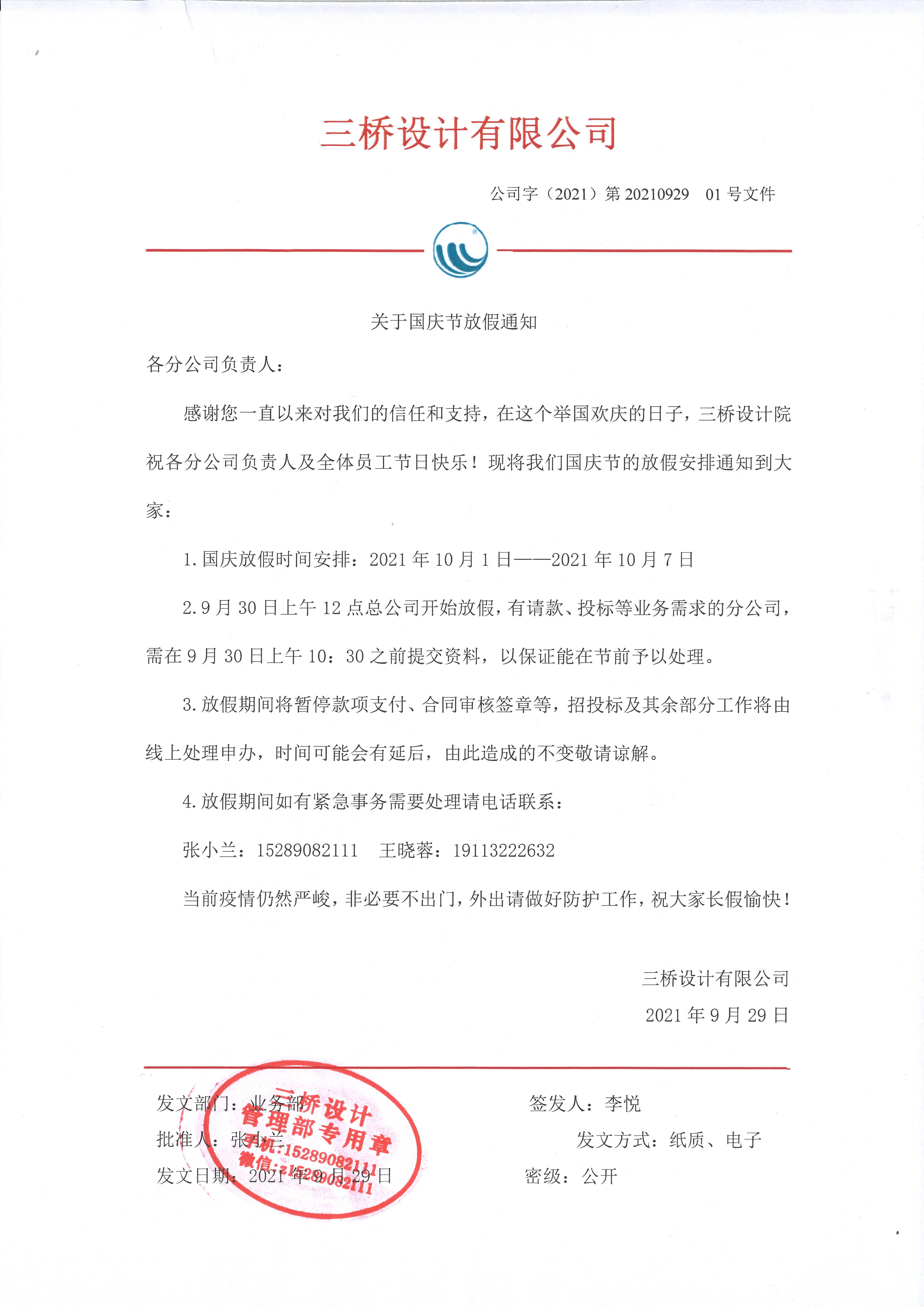 2.9月30日上午12点总公司开始放假,有请款、投标等业务需求的分公司,需在9月30日上午10:30之前提交资料,以保证能在节前予以处理。